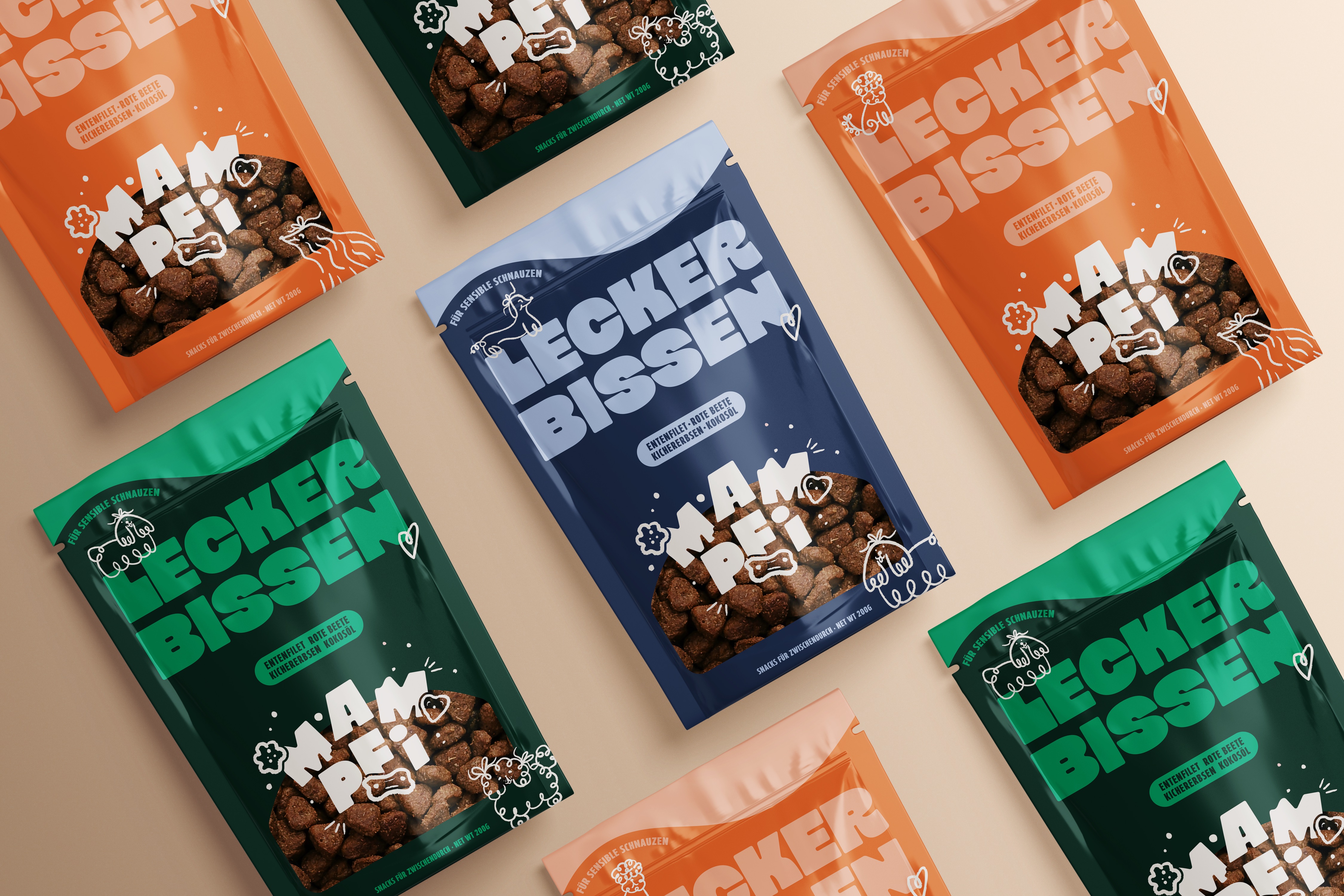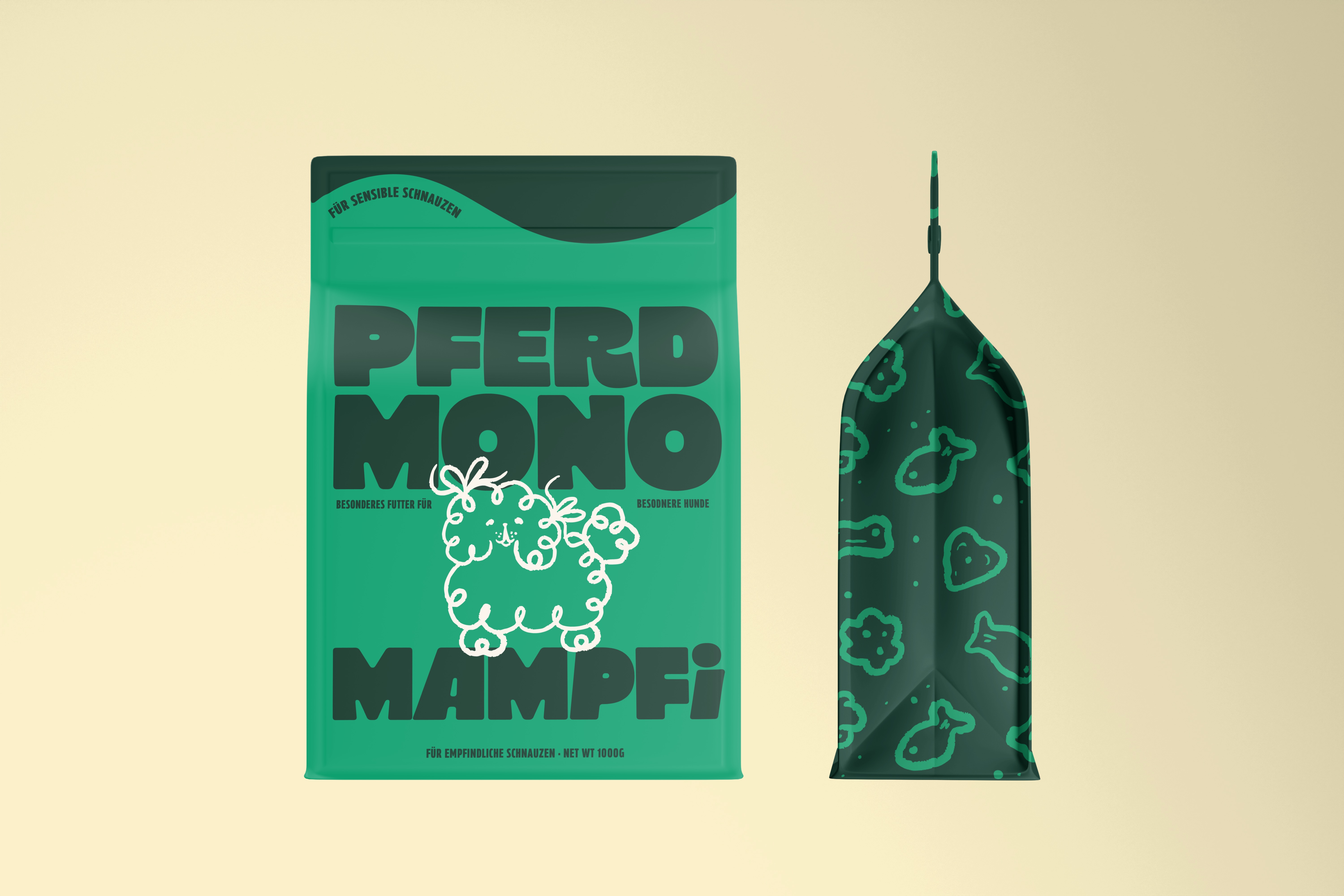 MAMPFI was developed as a concept project to explore how a dog food brand can move beyond functional packaging and nutritional claims. The starting point was a simple observation. Dog food often speaks to owners, but rarely to emotion. The goal was to create a brand that feels expressive, warm and full of character, turning everyday products into moments of connection, humor and joy.